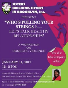 East New York non-profit, Sisters Building Sisters in Brooklyn, Inc, is presenting a Workshop on Domestic Violence at the office of Assembly Woman Latrice Walker at 400 Rockaway Ave.. They will be talking about healthy relationships, and more. See the full flyer below.